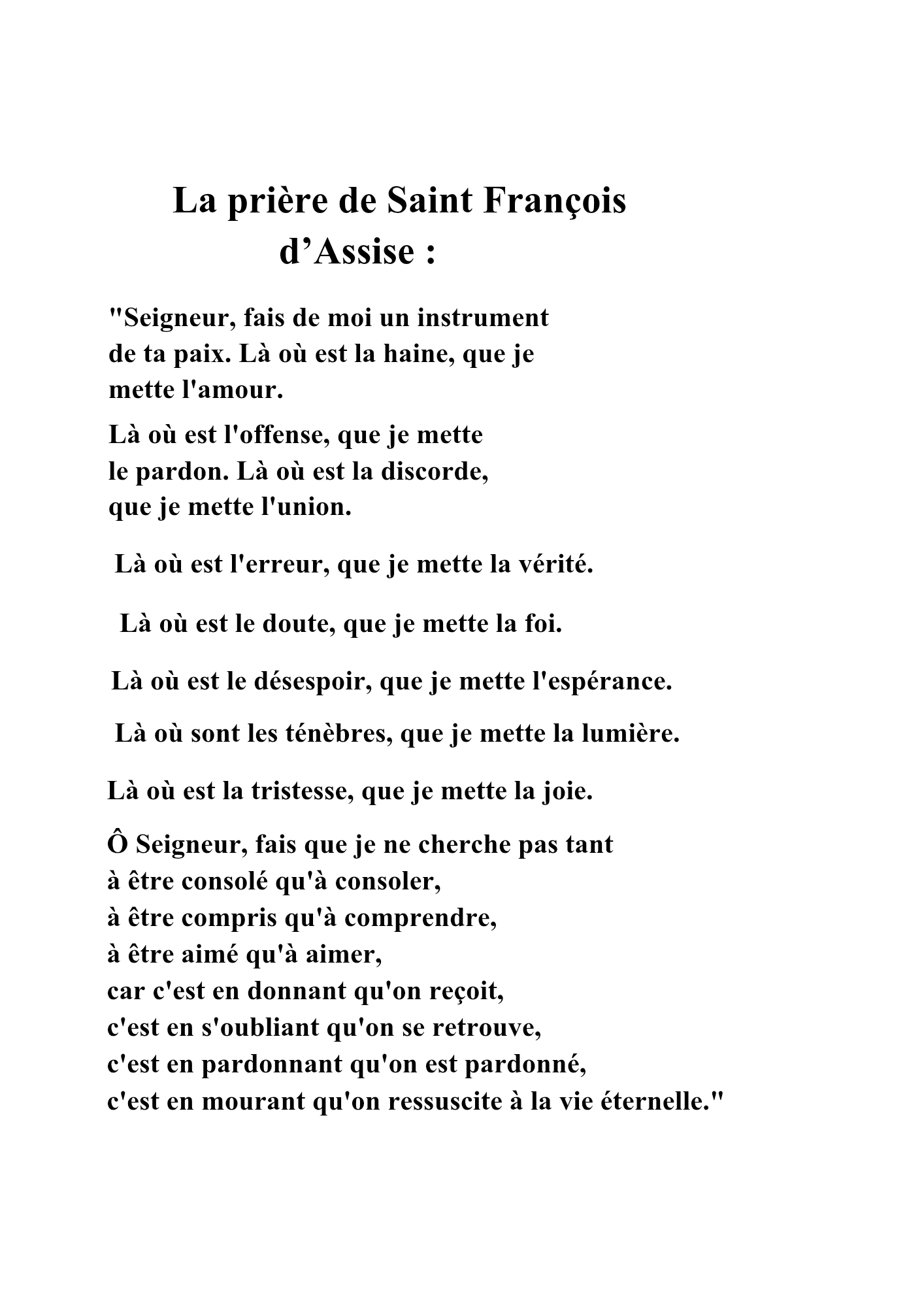 "Seigneur, fais de moi un instrument de ta paix. Là où il y a de la haine, que je mette l'amour."